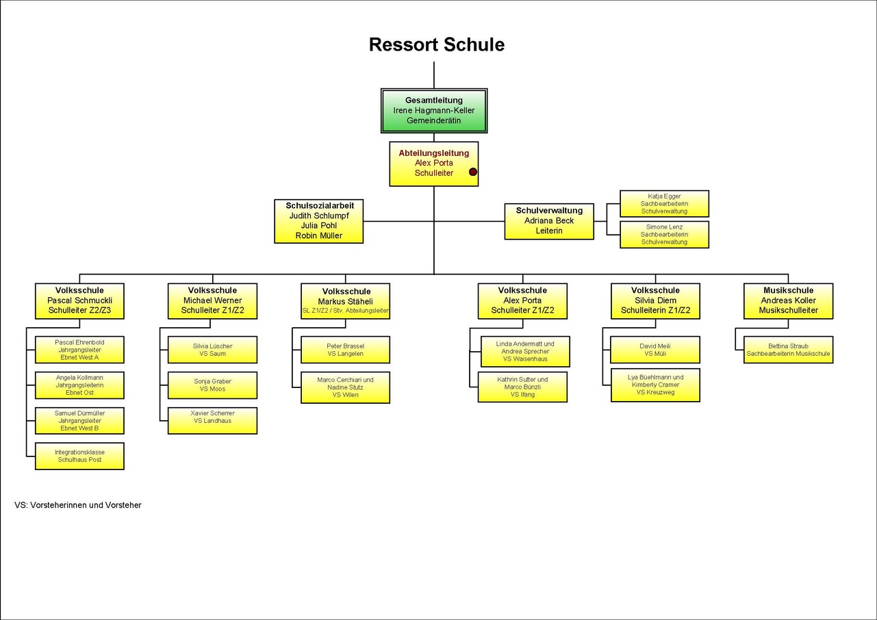 Die erweiterte Schulleitung setzt sich aus den Mitgliedern der Schulleitung und den Schulhausvorsteherinnen und -vorstehern zusammen. Die Vorstehenden übernehmen eine organisatorische Führungsverantwortung in den Schuleinheiten. Sie prägen als Initiatoren und Impulsgeber das Klima in den Schulen entscheidend.
